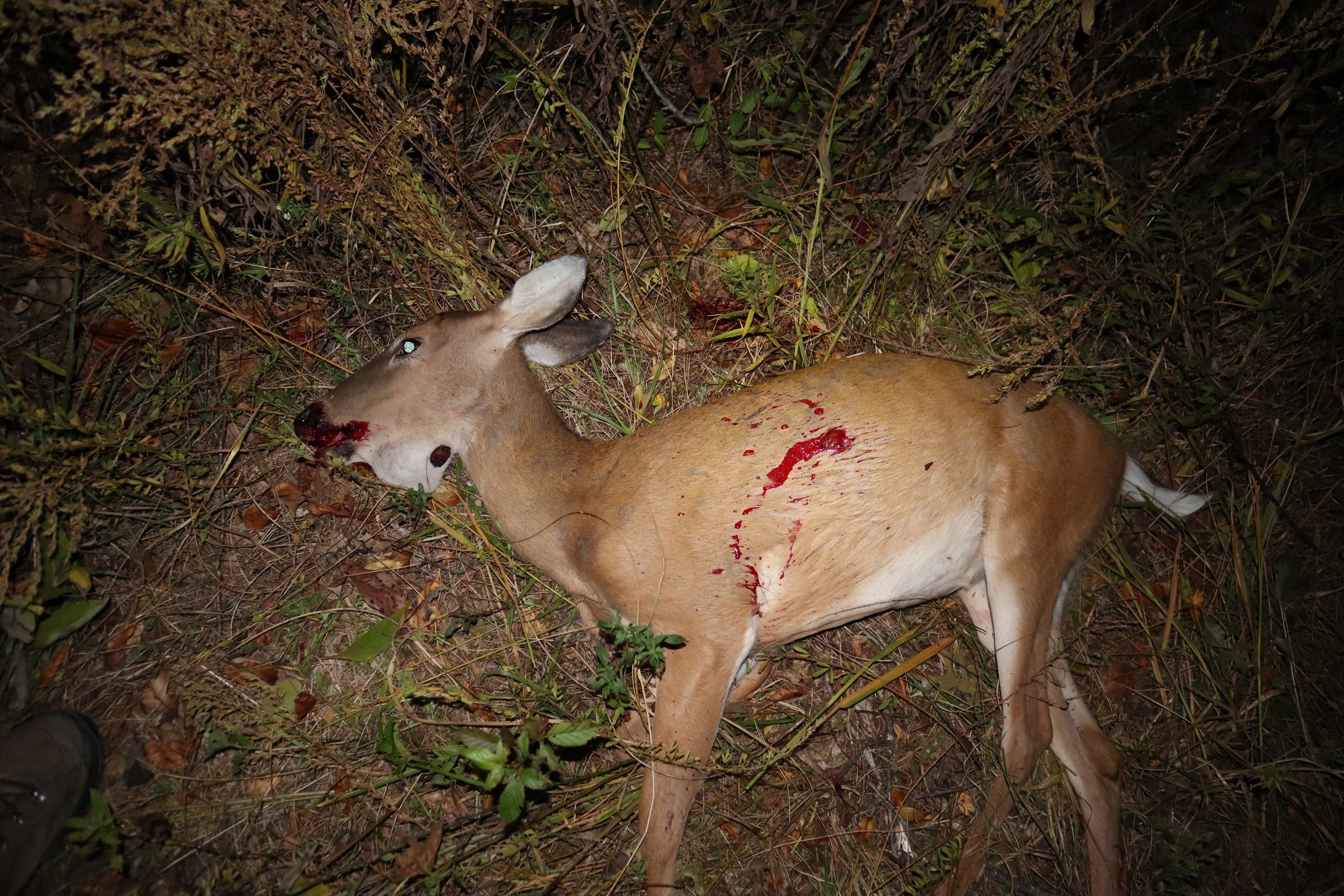After 40 minutes, I packed up my bag and headed towards the impact sight with somber anticipation. As I scanned the area with my headlamp, I saw no immediate blood. In unadvisable haste, I started walking in the direction I had seen the doe run, wondering if it could have fallen within sight. After 20 yards I still saw nothing, so I decided to walk back to the impact sight, find my arrow, and make a thorough investigation. Then, while walking back, I glanced to my left and was surprised to find the doe lying dead in a stand of tall grass. I had passed it in the dark, thinking it had run a slightly different direction.